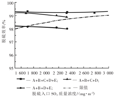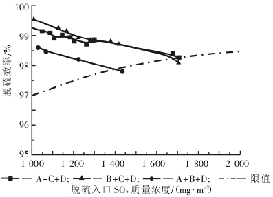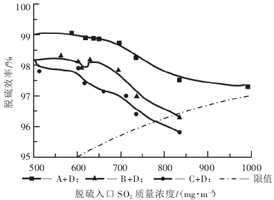 整体脱硫效率A+D>B+D>C+D,在SO2浓度小于700mg/m3时,3种运行方式的脱硫效率均能满足排放要求。