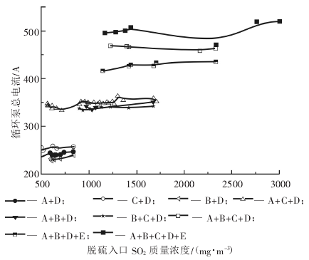 在烟气脱硫系统FGD (flue gas desulfurization)入口SO2浓度处于不同范围内时,分别调节循环泵的数量和组合方式,根据在线监测系统记录各浆液循环泵运行电流以及脱硫系统进出口SO2浓度。